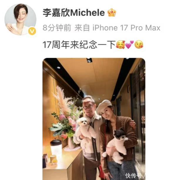 而近日,李嘉欣晒出结婚17周年纪念照,她和许晋亨站在饭店走廊内,一人抱着一只小狗。 背后的桌子上放着粉色花束,灯光温馨,氛围浪漫。 李嘉欣穿着棕色毛衣、牛仔裤,打扮的非常随意,但文艺范十足。
